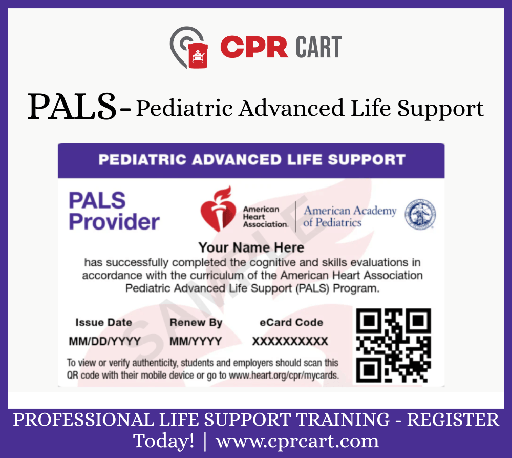 The PALS Certification course at CPR Cart is an American Heart Association–approved training program designed for healthcare professionals who care for infants and children during medical emergencies. The course follows a convenient two-step hybrid format, allowing students to complete the self-paced online HeartCode PALS training first and then schedule a short in-person skills check at a CPR Cart automated station. Participants learn pediatric assessment, respiratory and cardiac emergency management, shock treatment, team dynamics, medication administration, and post-cardiac arrest care. Hands-on skills validation typically takes about 30 minutes, and students receive their official AHA PALS Provider eCard immediately after successful completion, making certification fast, flexible, and ideal for busy healthcare providers.